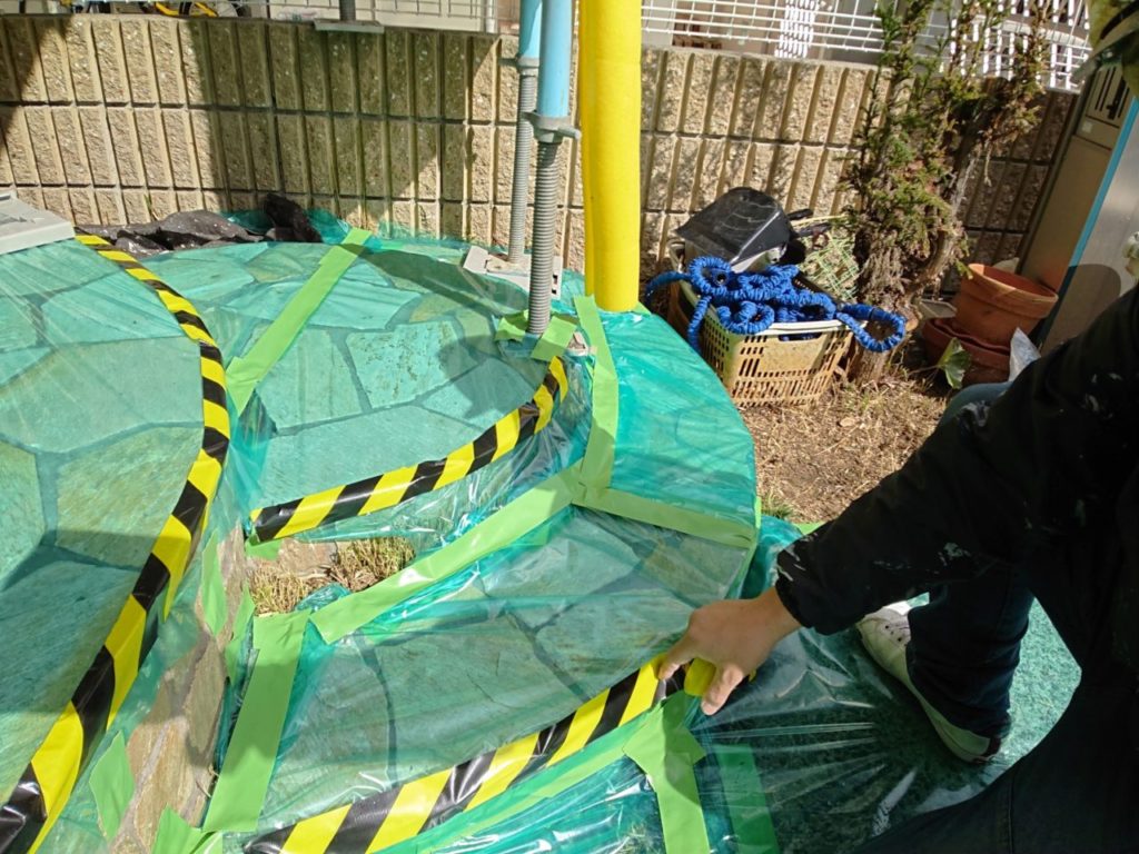 ↑こちらは土間・塀の布養生(ベトナムシート)ですっ👀 デブ🐖のくせに 狭くて作業しにくい所を 率先して作業する高橋🦍です👌笑笑 250mm~300mmの隙間があれば どこでも塗装させて頂きます☝️😲安心してくださいっ入れますよ👌笑