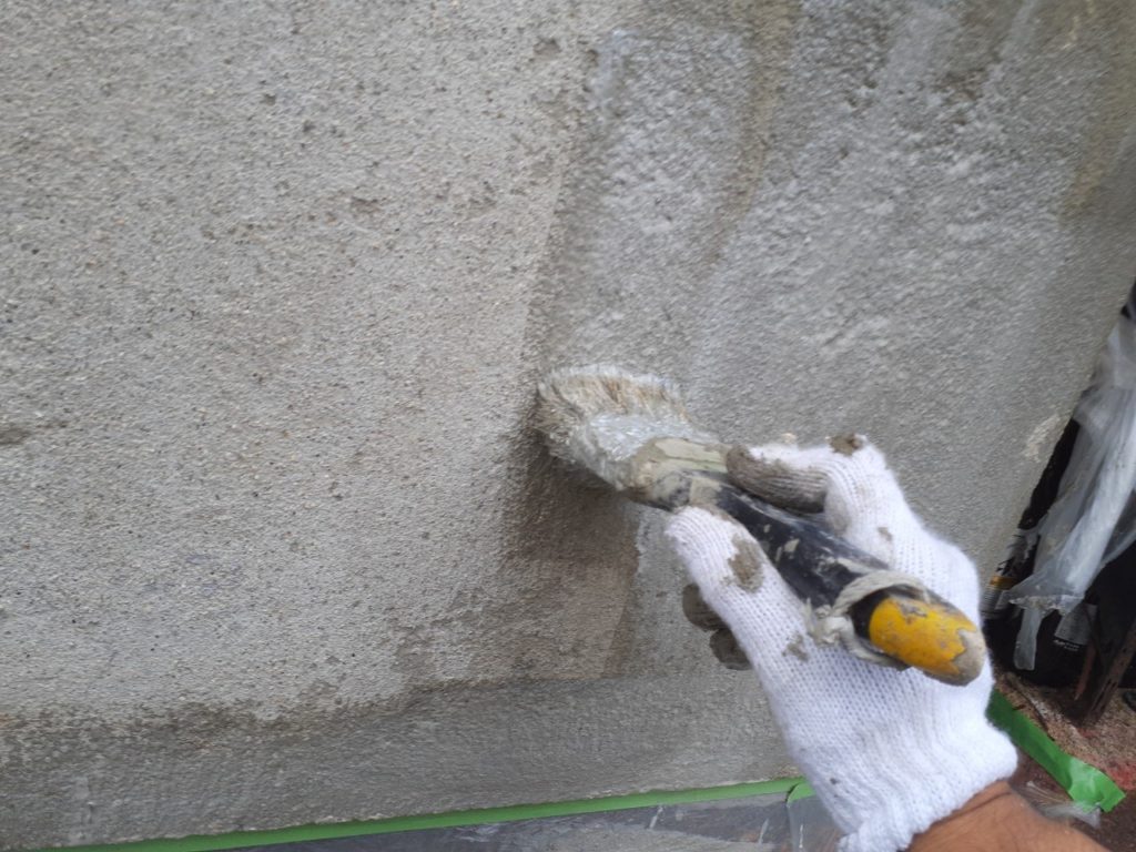 ↑プライマー塗布作業中 補修材(モルタル)が素地にしっかり密着するように 接着剤のような役割の塗料を塗布します😳