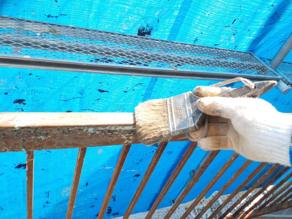 ↑鉄部 バルコニー手すり サビ止め(下塗り)塗布作業中