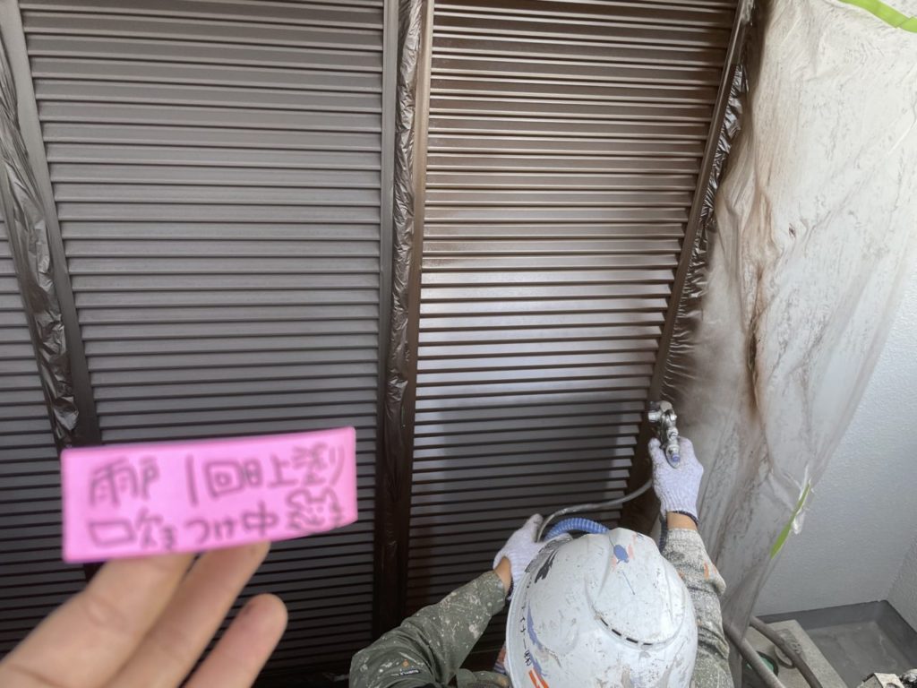 ↑雨戸 1回目 上塗り吹き付け作業中