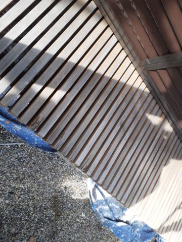 ↑ケレン作業中 ペーパーで表面の毛羽立ちなどを削ります🙋♀️ペーパーをあてるだけでも 表面上はきれいになるのですが 害虫や紫外線から守られていない状態なので こちらも防腐材を塗布していきます💁♀️❤️