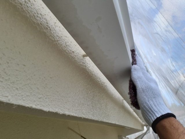↑付帯箇所 雨樋 ケレン作業中 目粗し作業とも呼ばれ 表面に傷をつける作業になります🙋♀️傷を付ける事で 引っかかりができ 密着が良くなります( ˙³˙ )