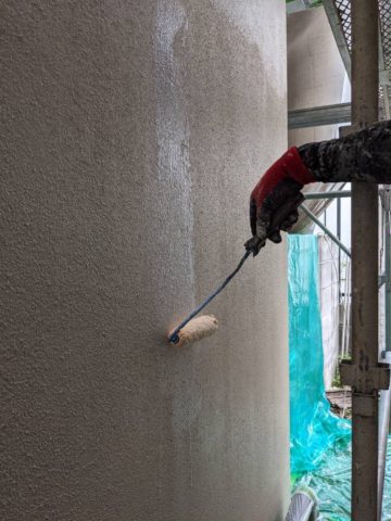 ↑外壁 下塗り作業中 フィラーと呼ばれる粘度の高い下塗り材になります🙋♀️