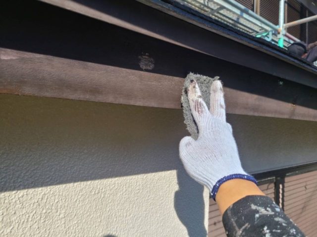 ↑鼻隠し箇所 目粗し作業中 塗料の密着を良くする為に 細かい傷を付ける作業になります🙋♀️ちなみにこちらの箇所は 後日雨樋が取り付けられるので 全く見えなくなります💁♀️見えなくなるけど 塗装するんです!笑 雨風から建物を守ってあげる為の塗装!見えなくなるけど 雨を弾くコーティング(塗装)は必要です🏠❁⃘*.゚
