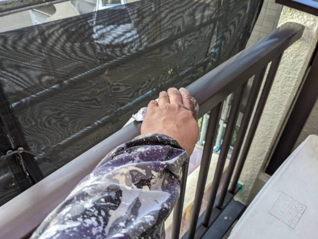 ↑バルコニー手すり(鉄部笠木) 2回目上塗り塗装中