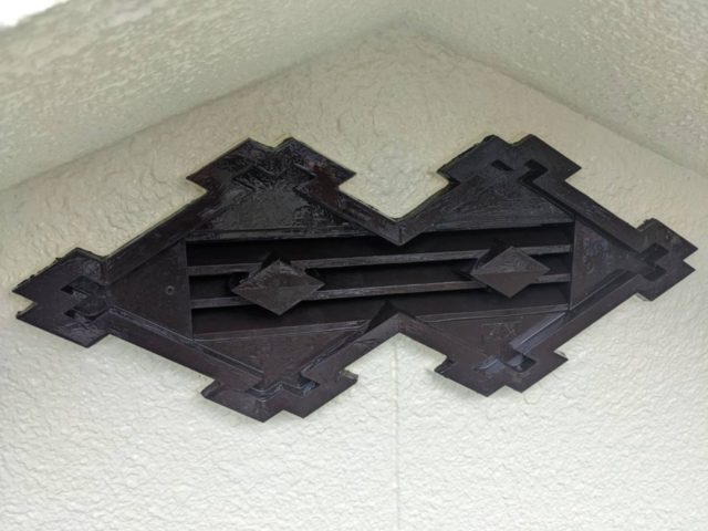 ↑付帯箇所 矢切換気口 2回目上塗り塗装中