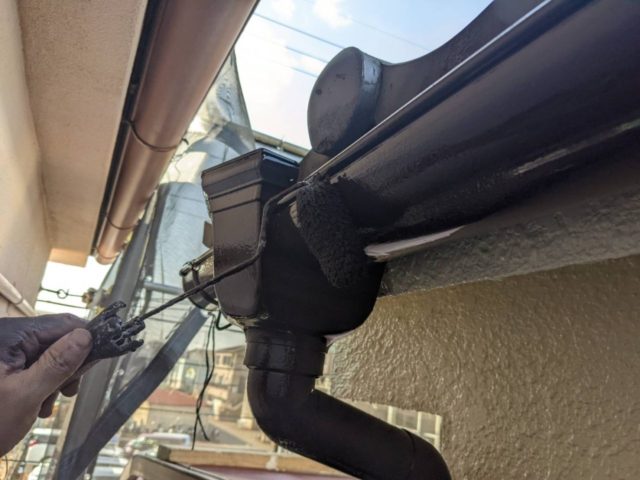 ↑付帯箇所 雨樋 1回目上塗り塗装中