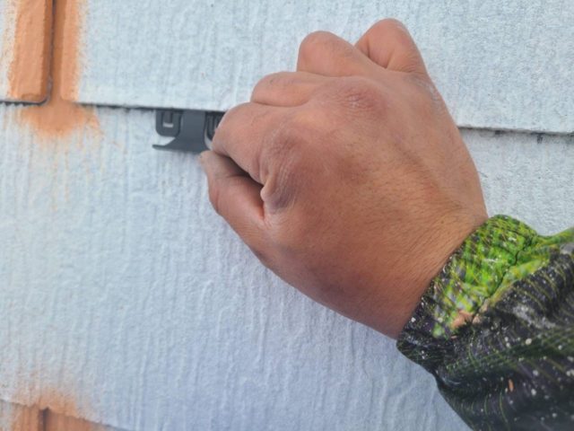 ↑タスペーサーと呼ばれる縁切り部材を挿入中( ‘-‘ )こちらのタスペーサーは 屋根材と屋根材の重なりあった隙間を確保するための建材になります🙋♀️♥️重なりあった隙間を塗料や藻やコケで埋めてしまうと 屋根裏に雨水がまわってしまい 雨漏りがおこります༼☉ɷ☉༽💔💔