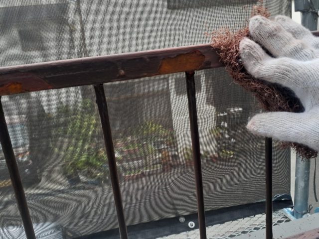 ↑鉄部手すり 錆止め(鉄部下塗り)塗布作業中