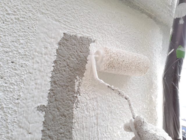 ↑欠損箇所を補修した箇所に下塗り塗布作業中