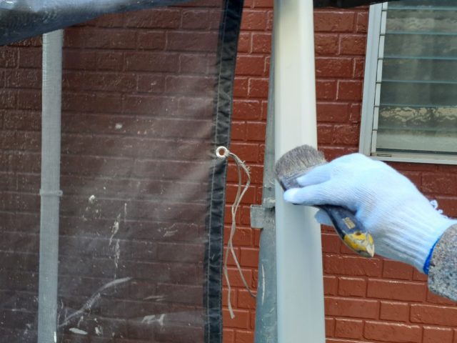 ↑外壁 クリヤー塗装箇所 1回目上塗り塗装中