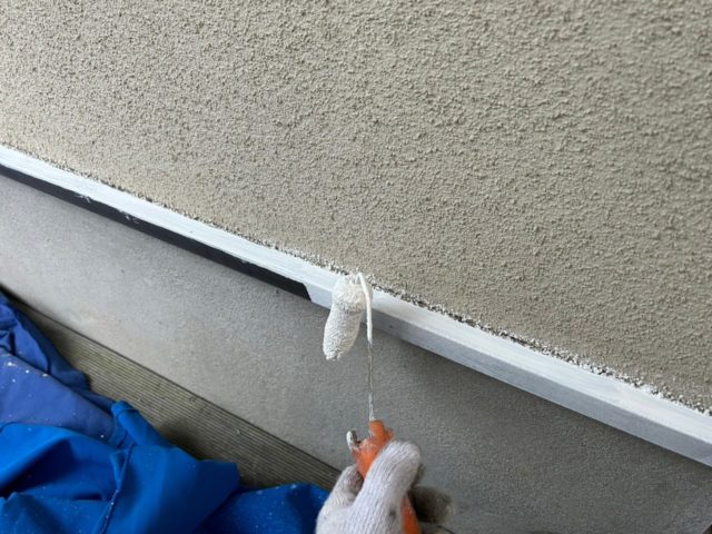 ↑土台水切り 錆止め(鉄部下塗り)塗布作業中