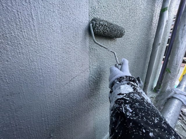 ↑外壁 上塗り(トップコート・シルバーグロスSi)塗布作業中 トップコートとは?雨風・紫外線から下地を守る為の仕上げ材になります💗
