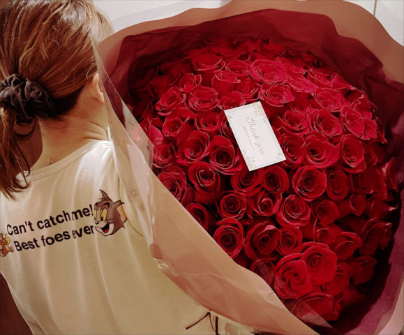 サプライズで108本のバラの花束もらったよ!🌹祝✨️何日か遅れの結⃝婚⃝記⃝念⃝日⃝😂💍108本は語呂合わせで 永遠に という意味らしいです😂ww オッサレー👏( ̄・ω・ ̄)