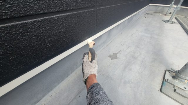 ↑ひさし(霧よけ) プライマー塗布作業中 プライマーとは?シーリング材の密着を良くする為の接着剤のような役割の塗料になります♥️