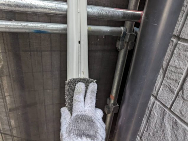↑付帯塗装 エアコンホース化粧カバー ケレン(目粗し)作業中 この目粗しとは?表面の汚れを取り除くとともに 表面に傷を付ける事で塗料の引っかかりをつくり塗料の密着を良くする為の役割があります(∩´∀`∩)💕