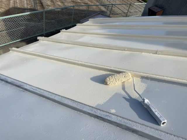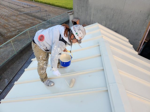 ↑屋根 上塗り(関西ペイント アレスクール)塗布作業中