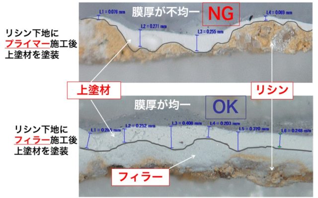 フィラー下地調整材であり シーラーやプライマーと比べて粘度が高く 厚みを付けることができます🤗乾燥後は柔らかい塗膜(微弾性)になるため 建物の動きやヘアークラックへの追従が期待できます(´🐽`)🫶