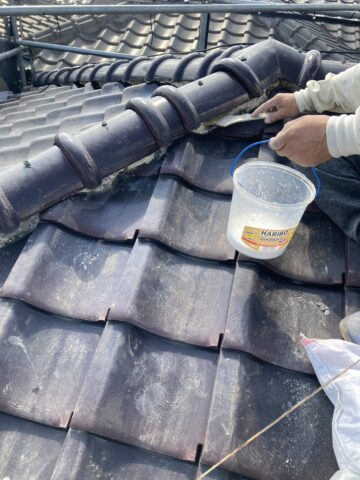↑接着剤のような塗料で一度葺き土を固め 漆喰の密着を上げる作業を行います🔆
