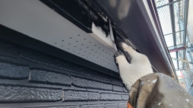 ↑付帯 鼻隠し板 1回目上塗り塗布作業中 こちらは刷毛ではなくベンダーと呼ばれる道具で塗装しています😲色んな道具があります🥳♥️キレイに仕上げることは天下一品!