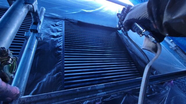 ↑雨戸 2回目上塗り(トップコート)吹き付け作業中
