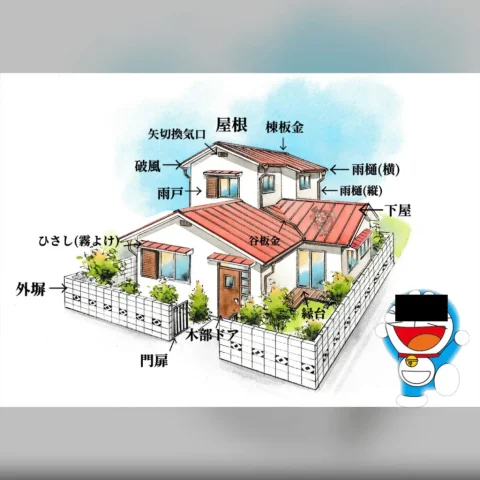 ↑あるアニメの某N様邸のお宅になります💁笑。お家を本体とした時の付属品箇所(後付け)にあたる箇所が付帯箇所になります!🙋♀️こちらでいうと 破風 庇 雨樋 雨戸 矢切換気口 縁台 門扉 などが付帯箇所になります( ̄・ω・ ̄)♥️