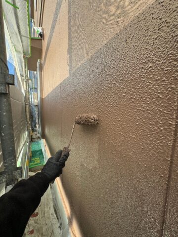 ↑外壁 ベース箇所 中塗り(トップコート)塗布作業中