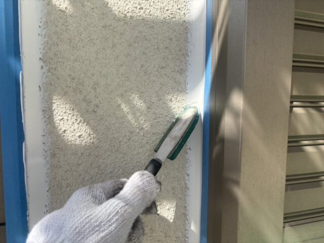 ↑サッシ廻り シーリングを均等に均し 整える作業中
