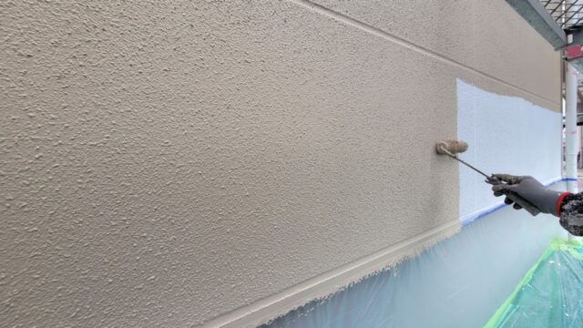 ↑外壁 ベース箇所 中塗り(トップコート)塗布作業中