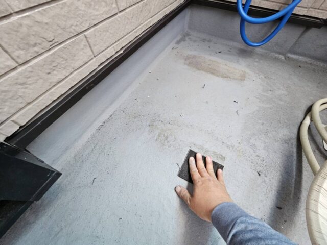 ↑バルコニー土間(床) トップコート塗布前の清掃中
