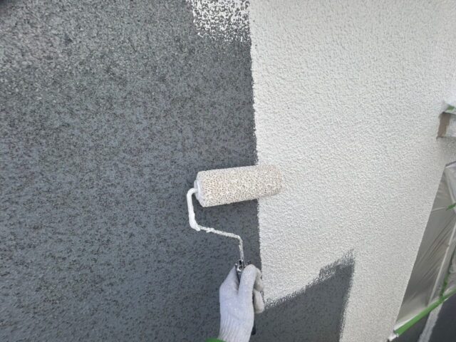 ↑外壁 2回目下塗り(フィラー)塗布作業中 こちらは1回目下塗り(シーラー)とは 別の下塗り材で下地調整(下地を整える)をするのに効果的な下塗り材になります😆❤「マスチック工法」粘度高い下地調整材の下塗り塗料を使用します💁🤍粘度が高いので下地に厚みをつけることのできる工法となっています|( ̄3 ̄)|❤下地に厚みをつけることができるので外壁が全体的に脆弱化している外壁や補修跡の多い外壁の塗装にオススメしている工法になります( ˶’ᵕ’˶)⸝♡