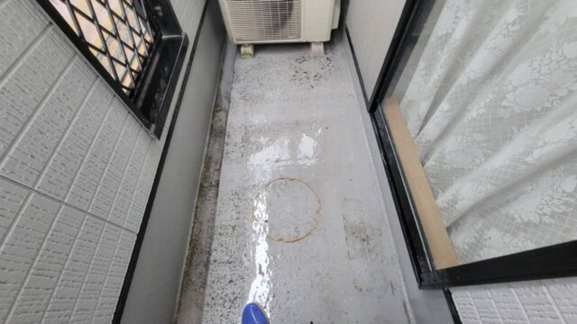 ↑バルコニー土間(床) 脱脂作業中 薬品を使って油分を拭き取る作業になります😊