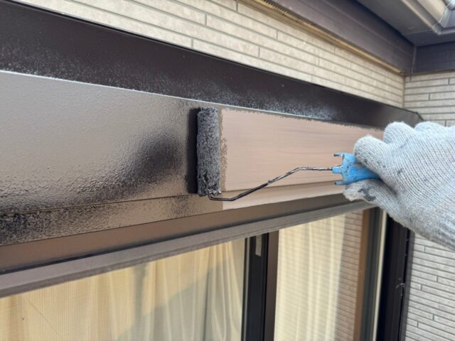 ↑シャッターボックス サビ止め(鉄部下塗り)塗布作業中