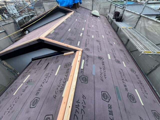↓↓↓屋根工事 ルーフィング張り付け作業 ルーフィングと呼ばれる下葺き材(防水シート)を既存屋根の上に貼り付けます🫡 屋根の上に屋根材を葺くので カバー(重ね葺き)と呼ばれています!瓦などでない限り 今は産廃などが少なく済む重ね葺きが主流になってきています💁🌍