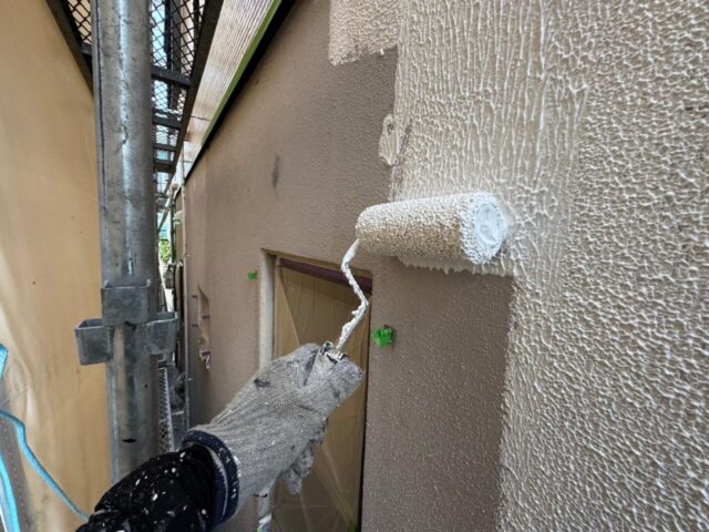 ↑モルタル箇所外壁 下塗り(マスチック工法)塗布作業中