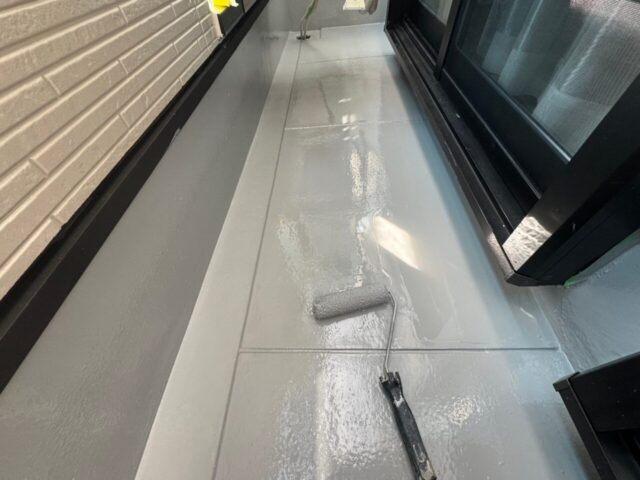 ↑バルコニー土間(床) ウレタン防水層二層目施工中