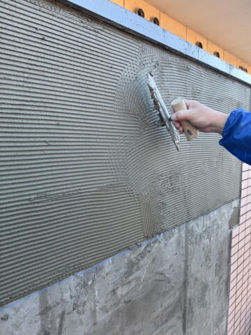 ↑外壁にタイルを張るため 接着剤のような役割の専用下地材を均し
