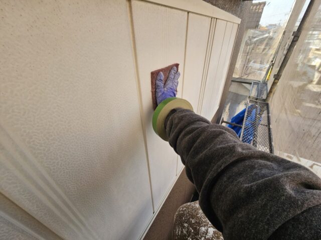 ↑シャッターBOX 目粗し作業中 目粗しとは?表面に細かい傷をつけることで塗料の密着をよくする大切な作業になります🥺高圧洗浄で落としきれなかったこびりついた汚れやサビなどを取り除く作業でもあります😆🤍