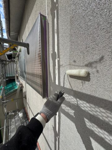 ↑外壁 上塗り(トップコート)塗布作業中