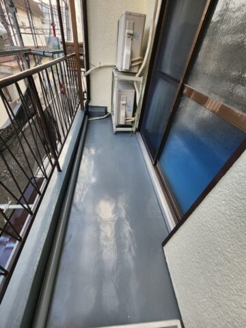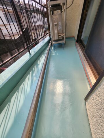 ↑バルコニー土間(床) ウレタン防水層1層目施工完了