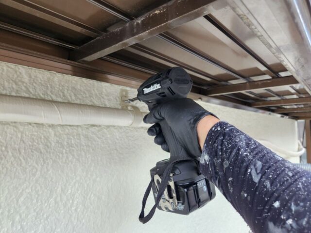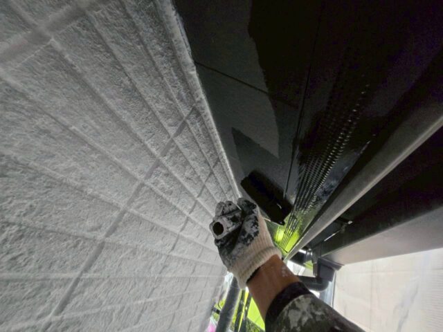 ↑軒天(上げ裏天井) 1回目上塗り(トップコート)塗布作業中
