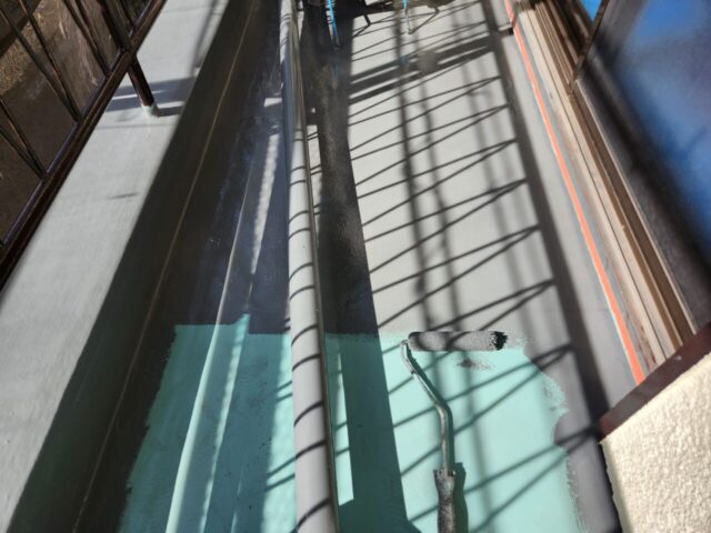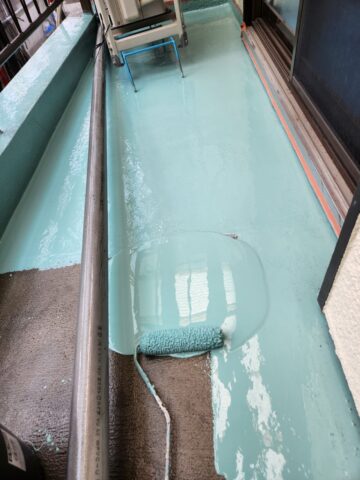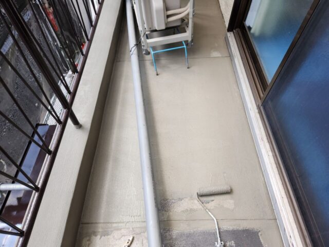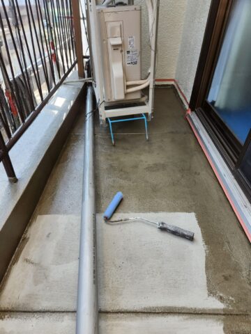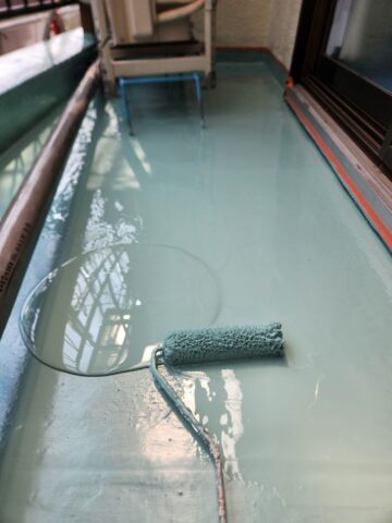 ↑バルコニー土間(床) 下地調整材塗布作業中 下地を整える役割の塗料を塗布作業中