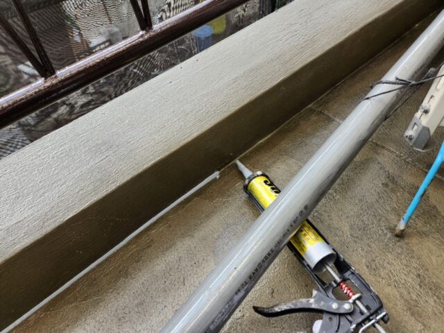 ↑バルコニー土間(床) 入隅コーキング充填作業中