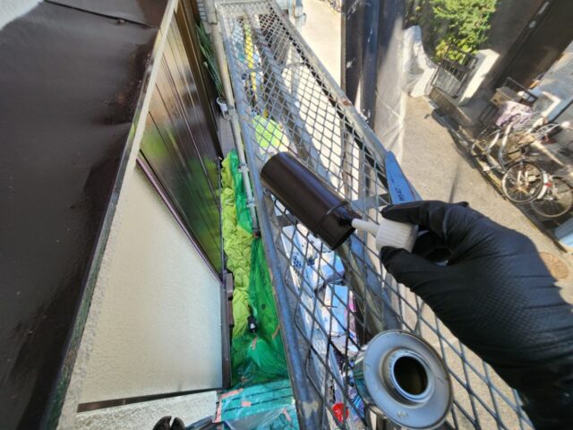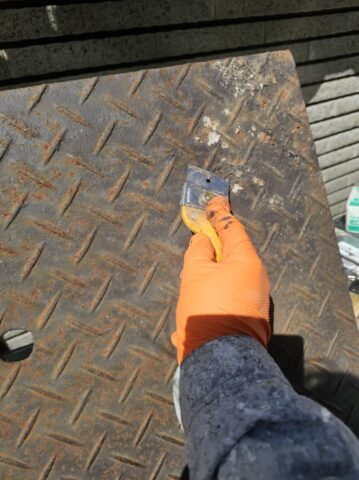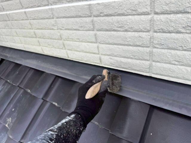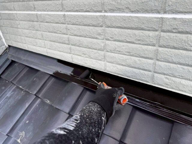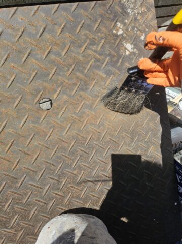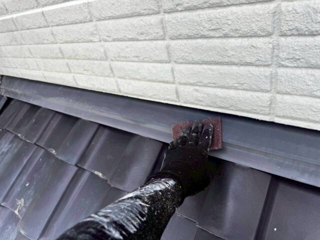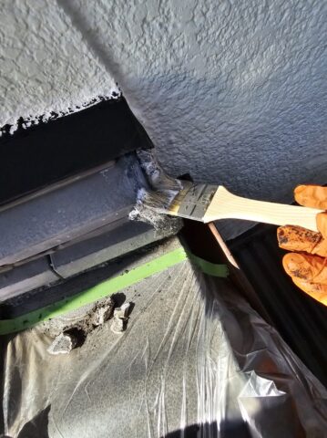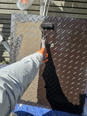 ↑雨押え板金 錆止め(鉄部下塗り)塗布作業中