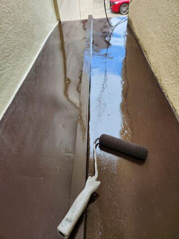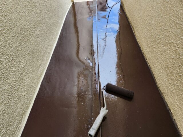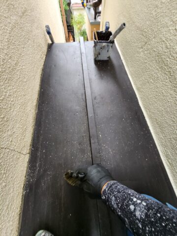 ↑瓦棒下屋 1回目上塗り(トップコート)塗布作業中