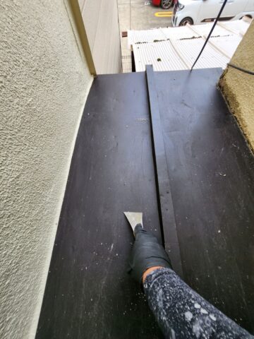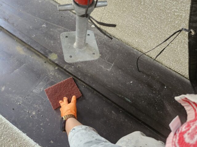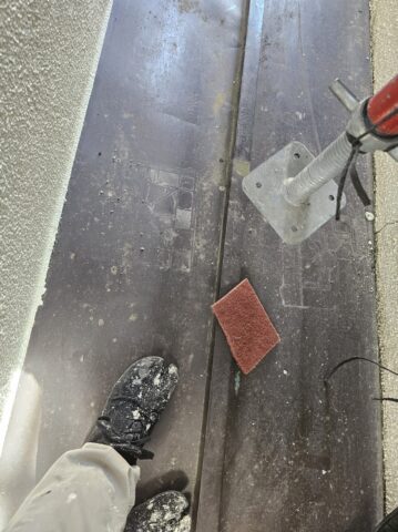 ↑瓦棒下屋 錆止め(鉄部下塗り)塗布後のケレン作業中 表面を平滑に仕上げるためのひと手間になります🥺