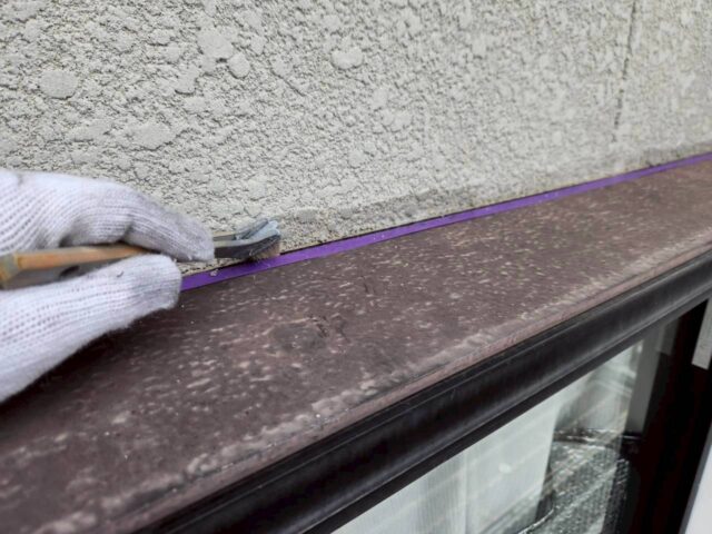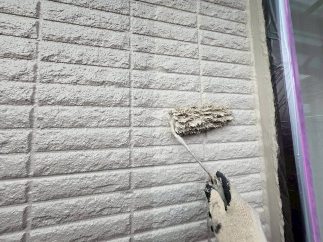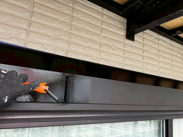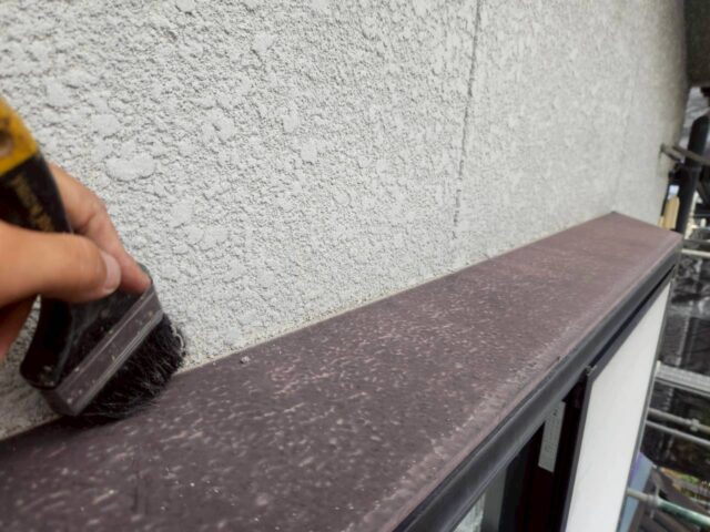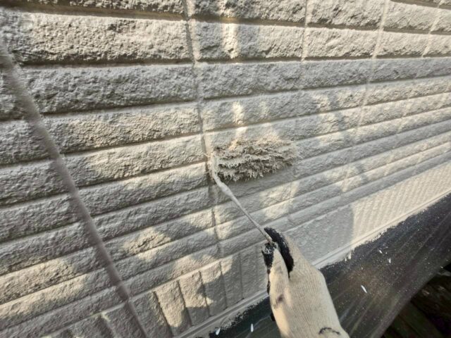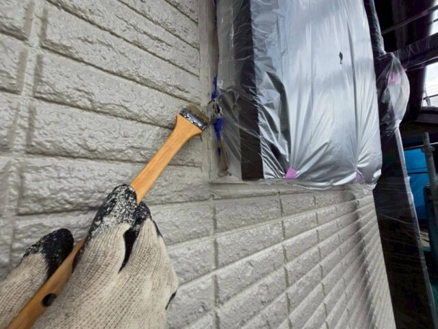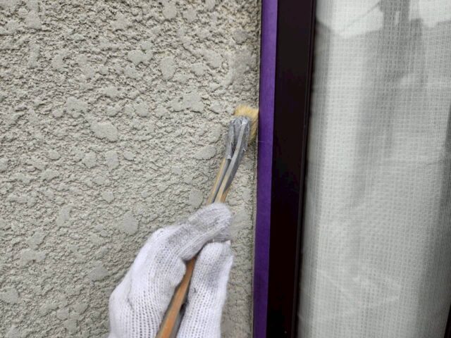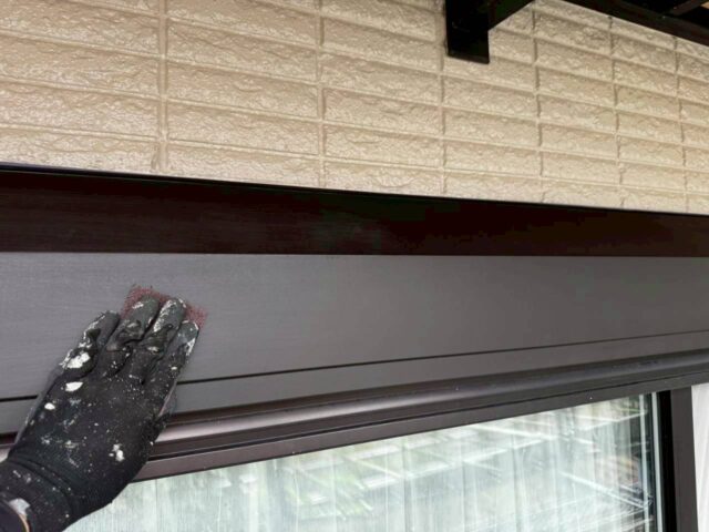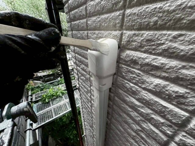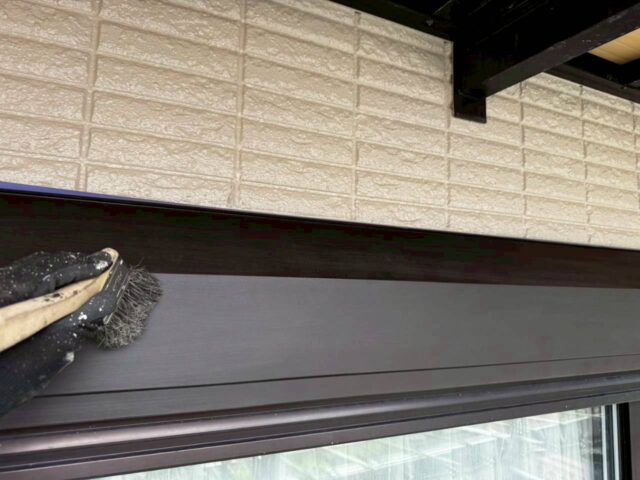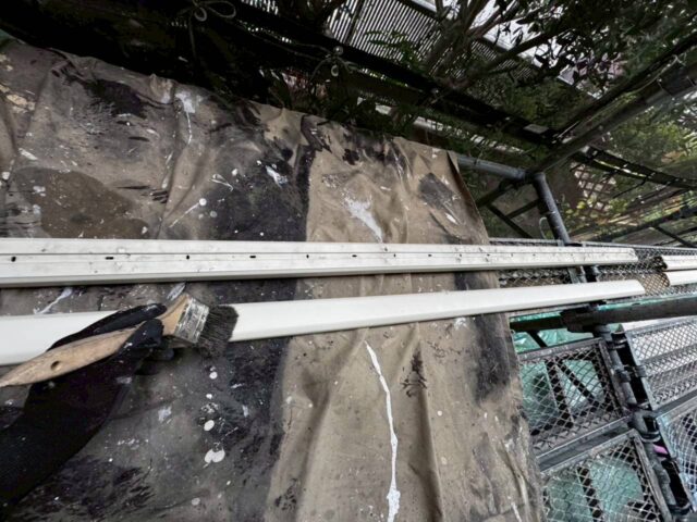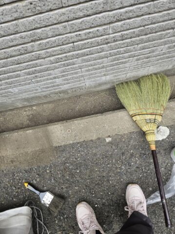 ↑外壁 チリ取り作業中 チリ取り作業とは?細かくてローラーなどでは塗装できない箇所を刷毛で塗装することです🥺