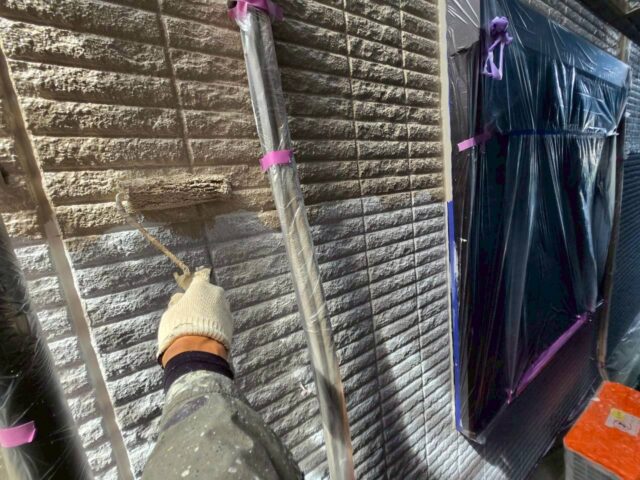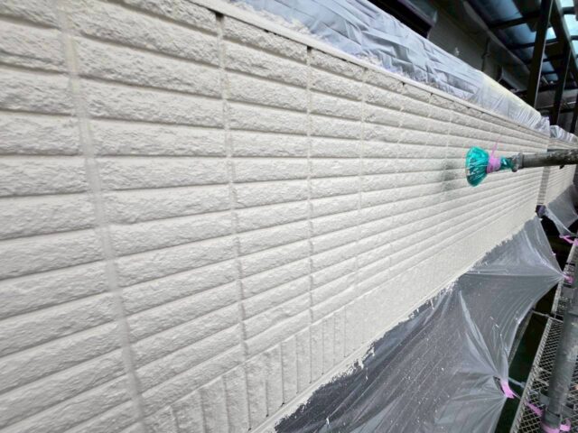 ↑外壁 中塗り(トップコート)塗布作業中 トップコートとは?紫外線や雨から下地を守るための保護仕上げ材になります💁♂️皆様が気にされる塗料のグレードは こちらのトップコートのグレードになります💁♂️🤍