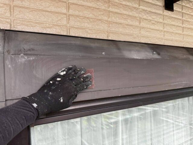 ↑シャッターボックス 目粗し作業中 目粗し作業とは?表面に細かい傷をつけることで塗料の密着をよくする大切な作業になります🥺高圧洗浄で落としきれなかったこびりついた汚れやサビなどを取り除く作業でもあります😆🤍