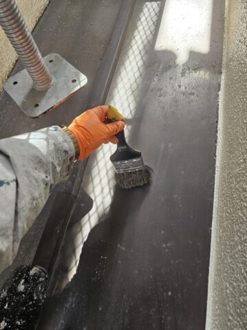 ↑瓦棒下屋 錆止め(鉄部下塗り)塗布作業中 価格競争が進む中 こういった付帯箇所に下塗り材を塗布する業者も少なくなりましたが 耐久性を考えると間違いなく必要な工程になります😆
